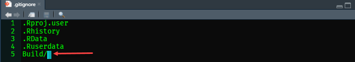 The .gitignore file keeps track of the files and folders you need to keep in your repository and those you do not. In this case, the Build folder is kept out of your online repository. Remember, the files within the Build folder can be created 100% from the source files. To accomplish this, simply open the .gitignore file in R studio and add the line Build/ to “ignore” it in future Git remote commands.